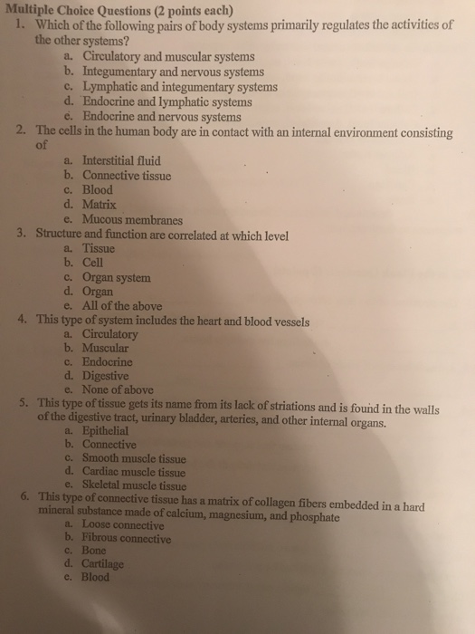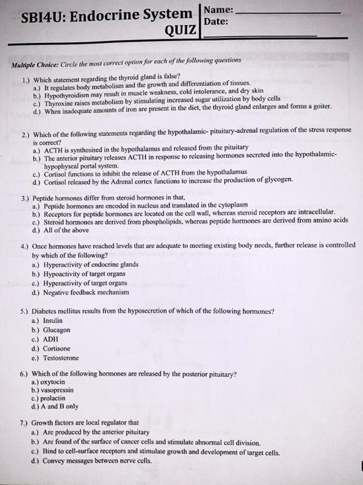 Which of the following statements regarding pituitary hormones is false. B Antidiuretic hormone released by the posterior pituitary causes urine volume to increase and blood volume to decrease. The most precise diagnostic screening procedure for differentiating benign thyroid nodules from malignant ones is. Bookmark File PDF Endocrine System Multiple Choice Questions And Answers Endocrine System Multiple Choice Questions And Answers This book is intended to give readers a quick look at metabolic and endocrine physiology. A 31-year-old woman who has two healthy children notes that she has had no menstrual periods for the past 6 months but she is not pregnant and takes no medications. A Medullary carcinoma thyroid. Please answer all questions. Answer the following multiple-choice questions. Learn vocabulary terms and more with flashcards games and other study tools.